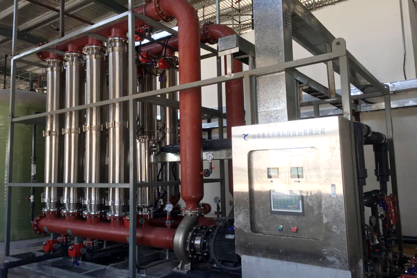 山東泰禾環??萍脊煞萦邢薰狙h水廢水回用處理系統包括一體化高速反應池,壓濾機去硬度和固體雜質,然后依次連接的自清洗過濾器、陶瓷膜超濾組件和RO反滲透膜組件,該循環冷卻水廢水回用系統的脫鹽率大大提高,作為循環冷卻水系統補給水循環使用,有效優化循環冷卻水水質,降低循環冷卻水的鹽分濃度。
